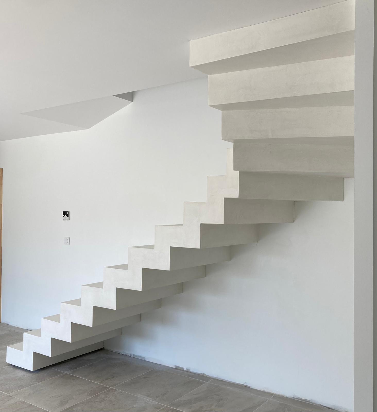 Création d’une crémaillère en béton ciré, avec un effet volant de teinte “craie” dans le département de la Gironde.