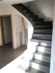Bel escalier à paillasse un quart tournant habillé en béton ciré couleur gris orbital