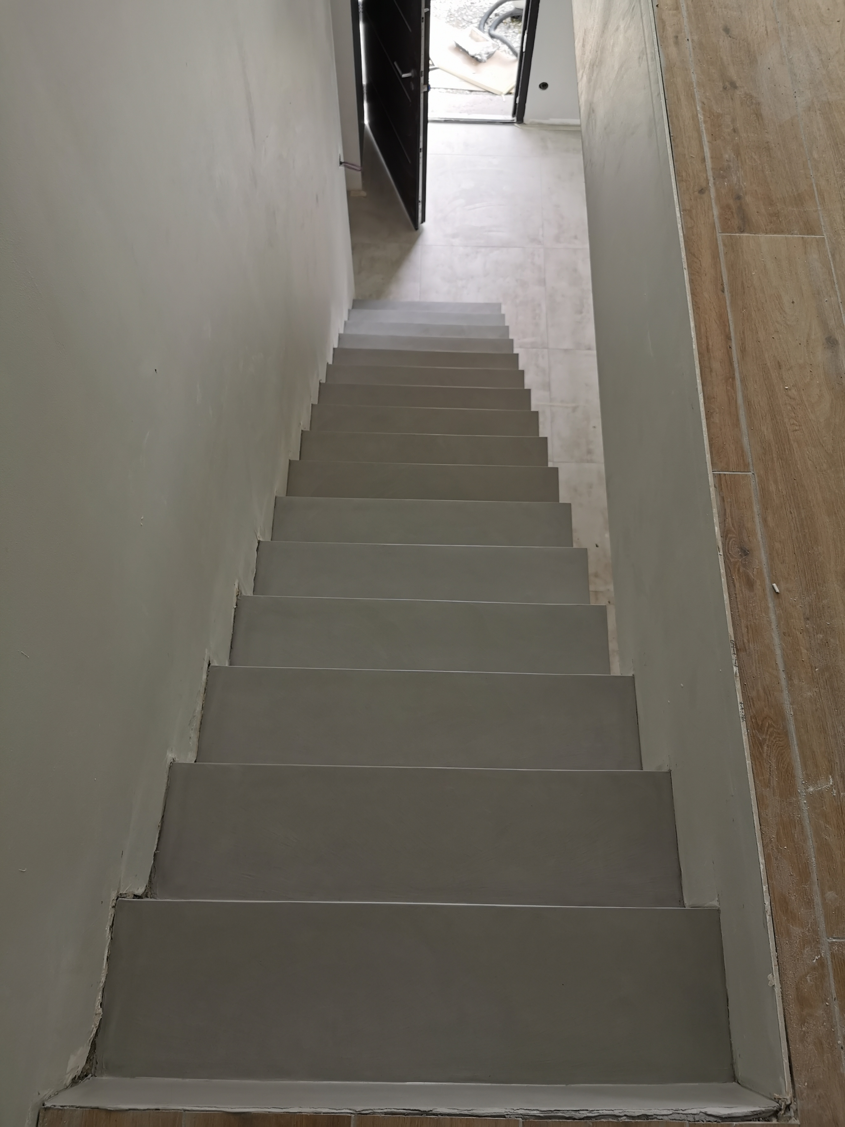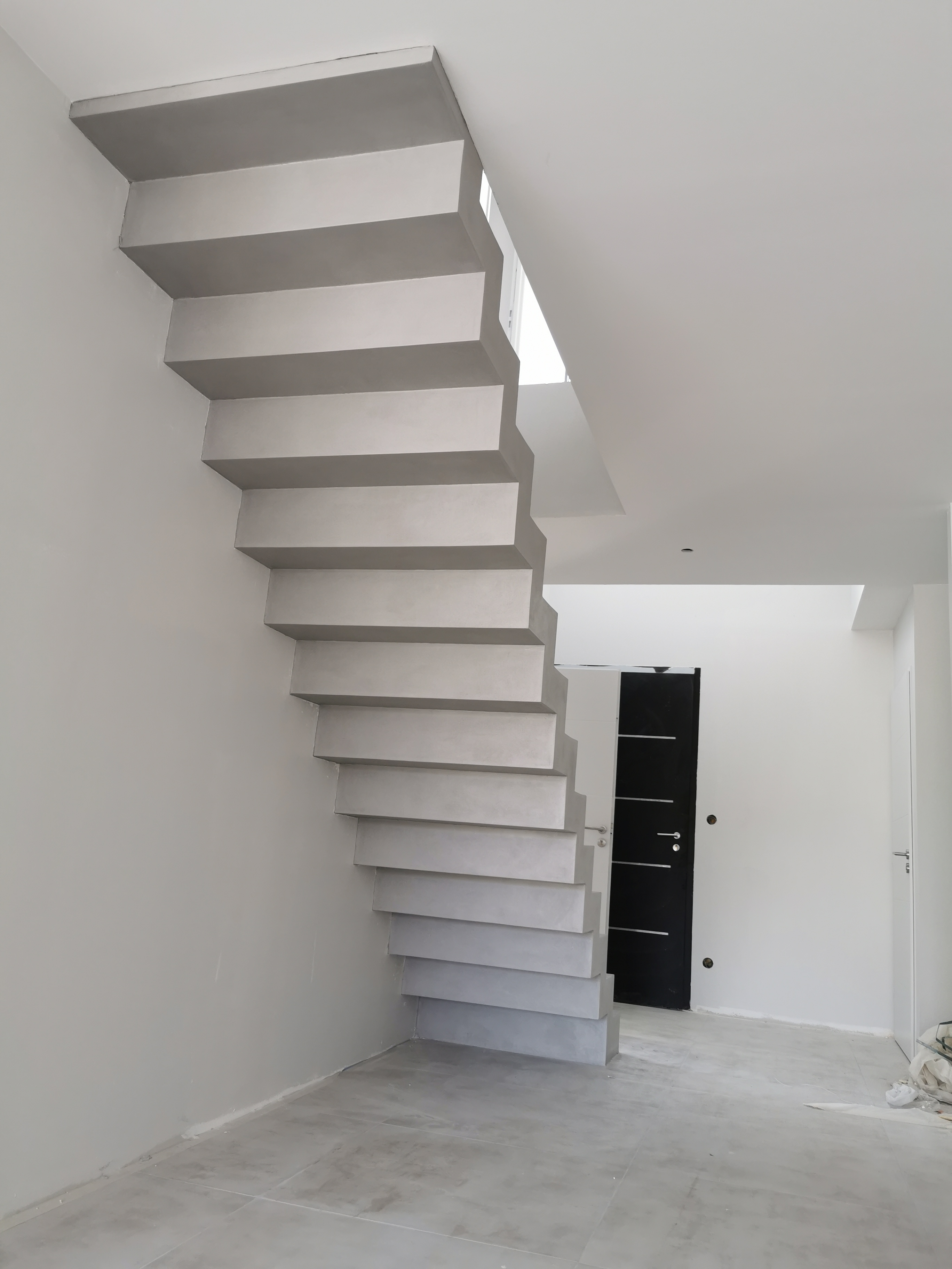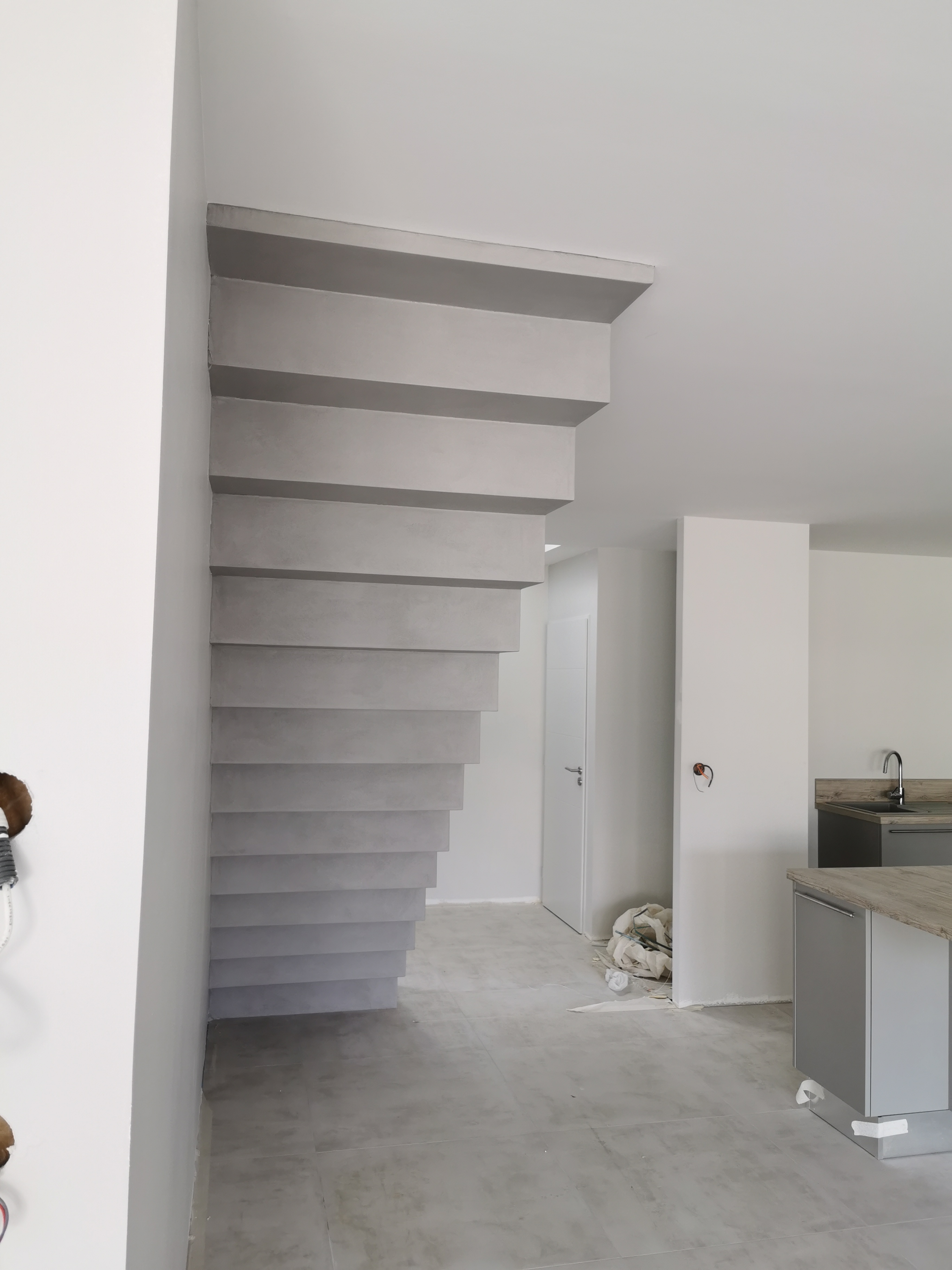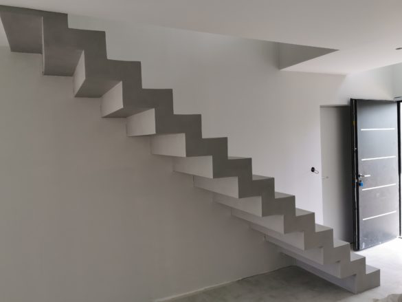 Bel escalier crémaillère sur mesure en béton ciré vernis mat couleur gris souris