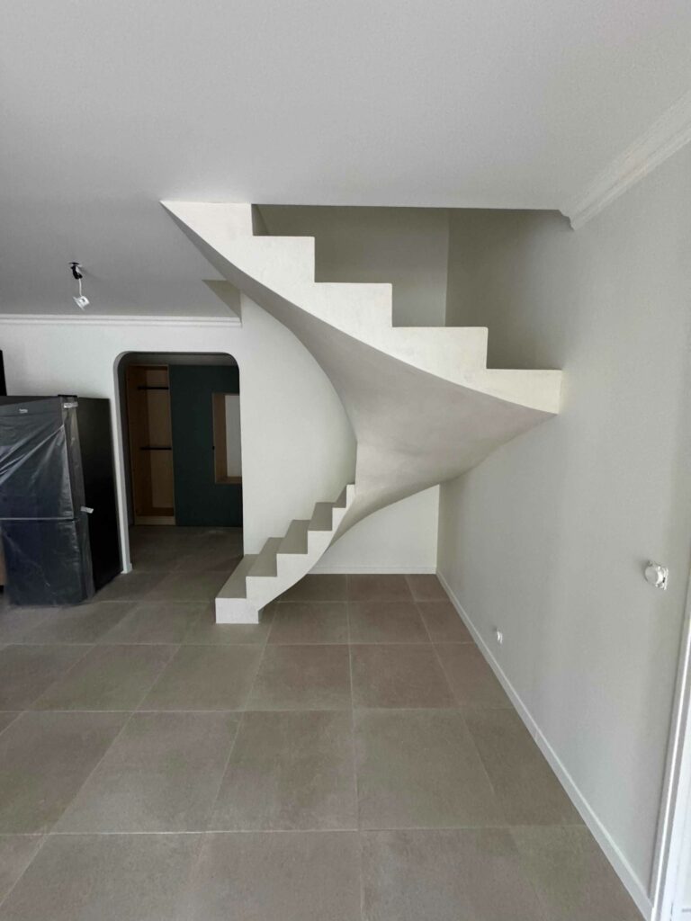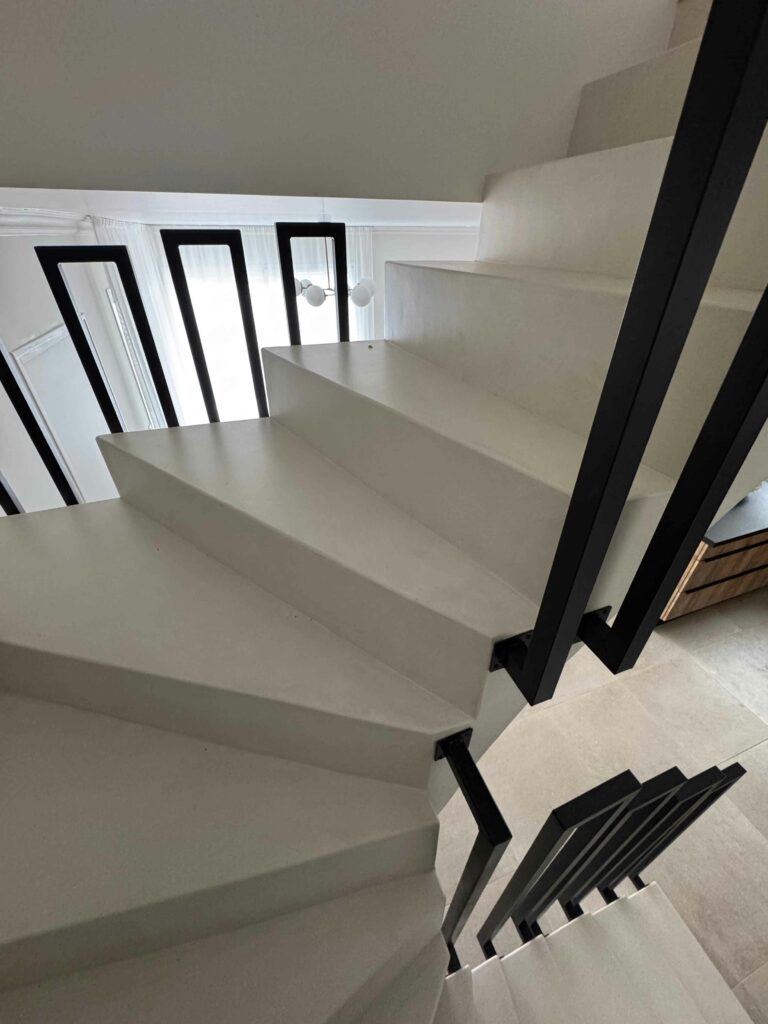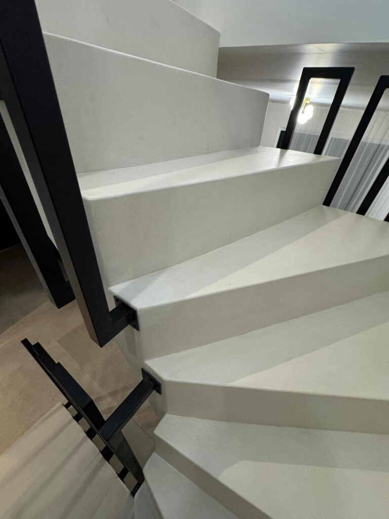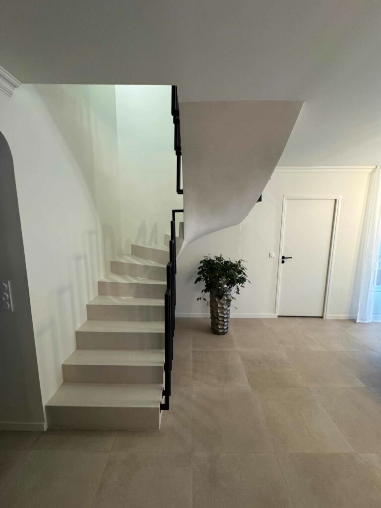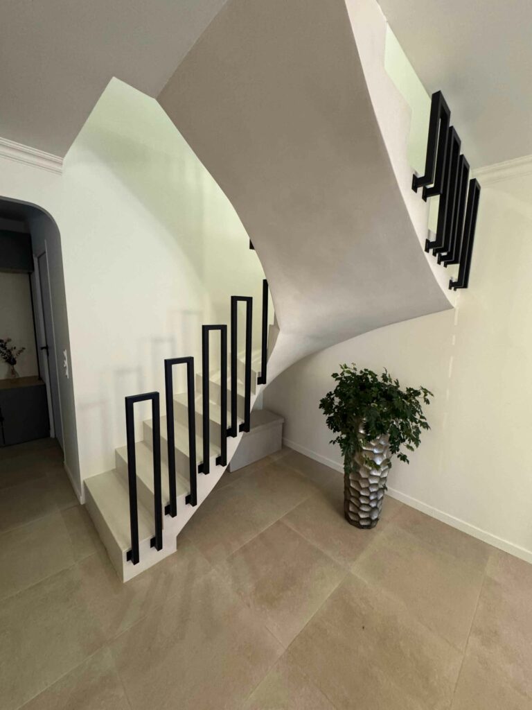 💥 Un escalier pensé comme une pièce architecturale : voile torsadée, lignes géométriques et finition en béton ciré galet de chez Ad Lucem pour un rendu doux, minéral et contemporain.