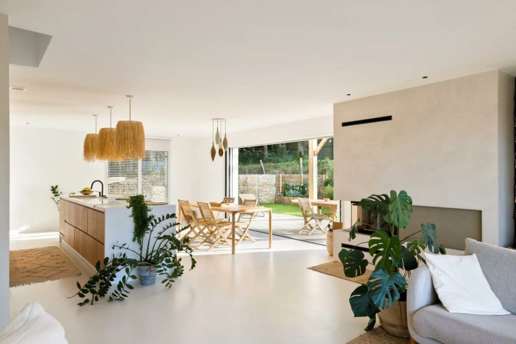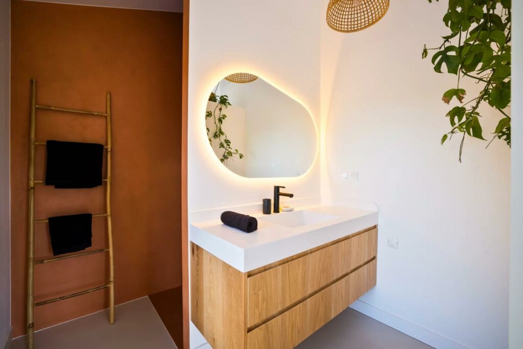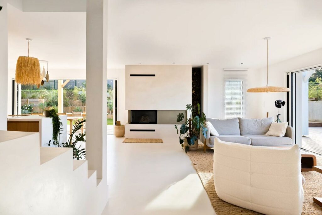 Associé au bois et à la lumière naturelle, le béton ciré révèle ici toute sa capacité à sublimer les volumes sans jamais les figer.