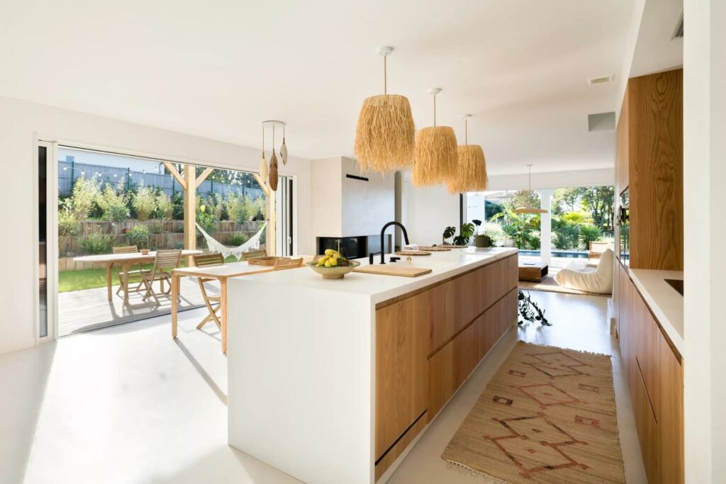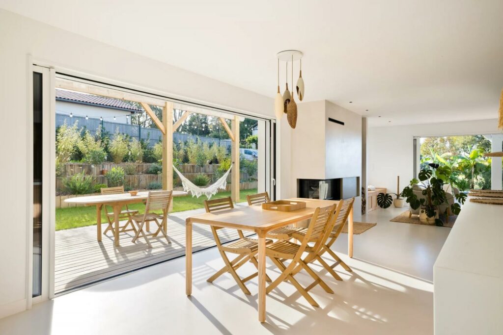 Dans cette maison située à Arbonne dans les Pyrénées-Atlantiques, le béton ciré devient le fil conducteur de l’architecture intérieure.
