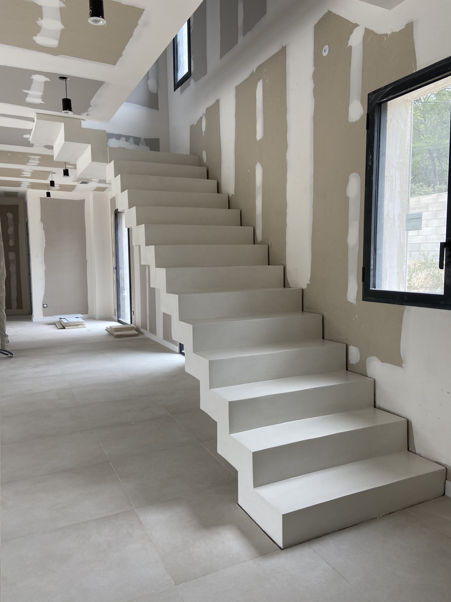 Escalier à crémaillère avec palier intermédiaire, teinte terracotta, réalisé en 3 jours dans une maison individuelle, à Avignon près de Nîmes et Orange.