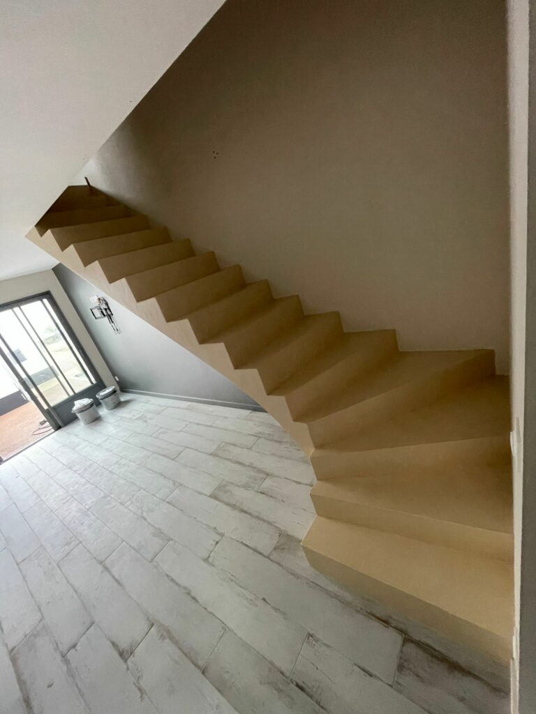 Résistant, intemporel et parfaitement intégré à l’espace de vie, le béton ciré transforme l’escalier en un élément à la fois fonctionnel et esthétique.