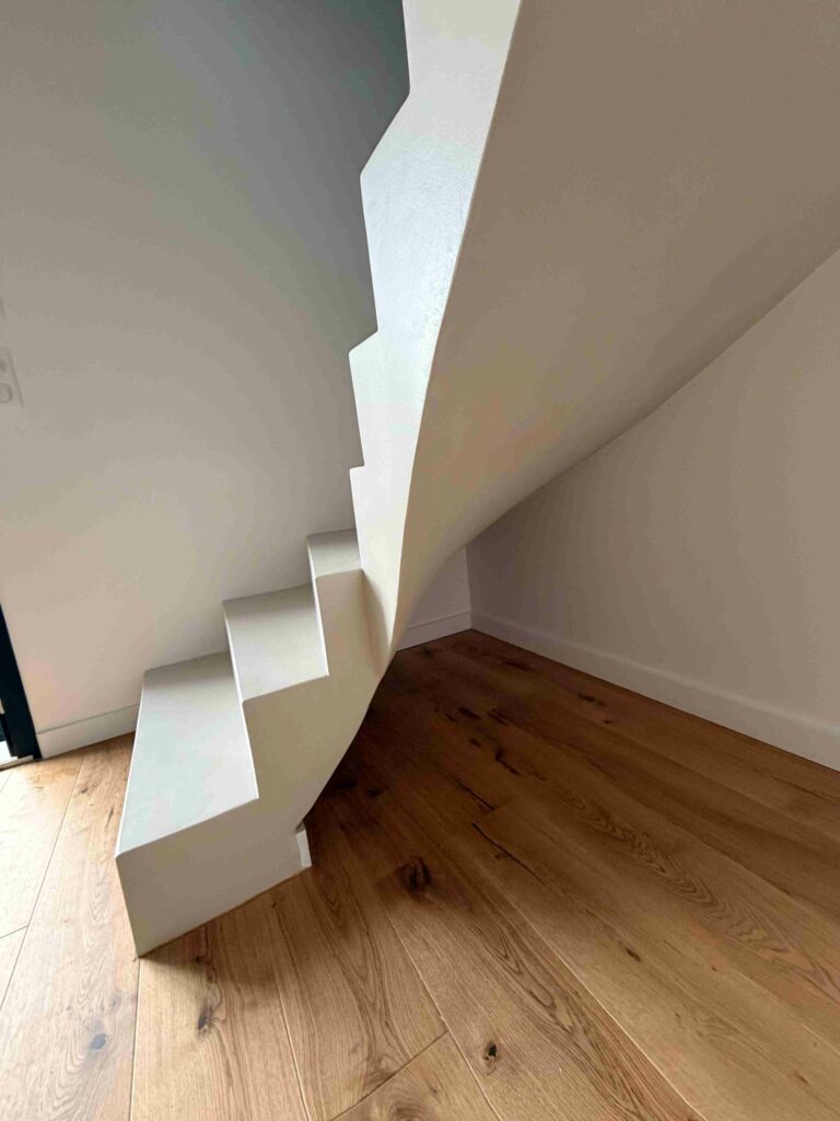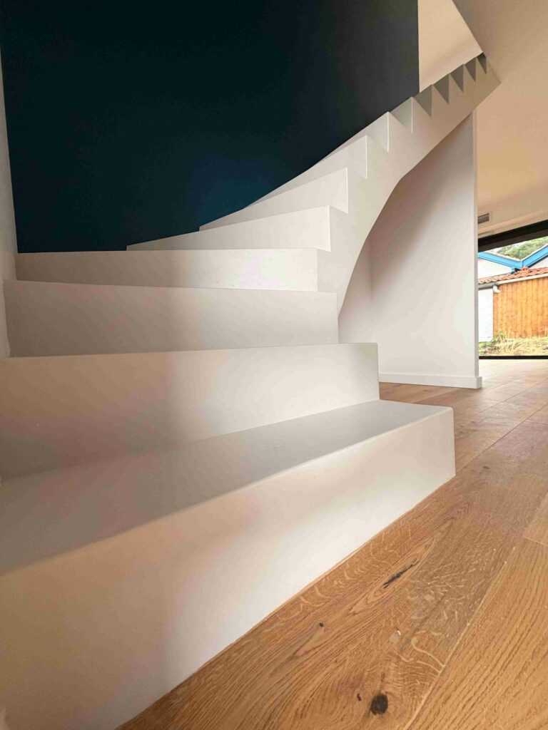 Ses marches pleines et ses arêtes nettes mettent en valeur la finesse du matériau, tandis que la structure tournante apporte du rythme et de la légèreté à l’espace.