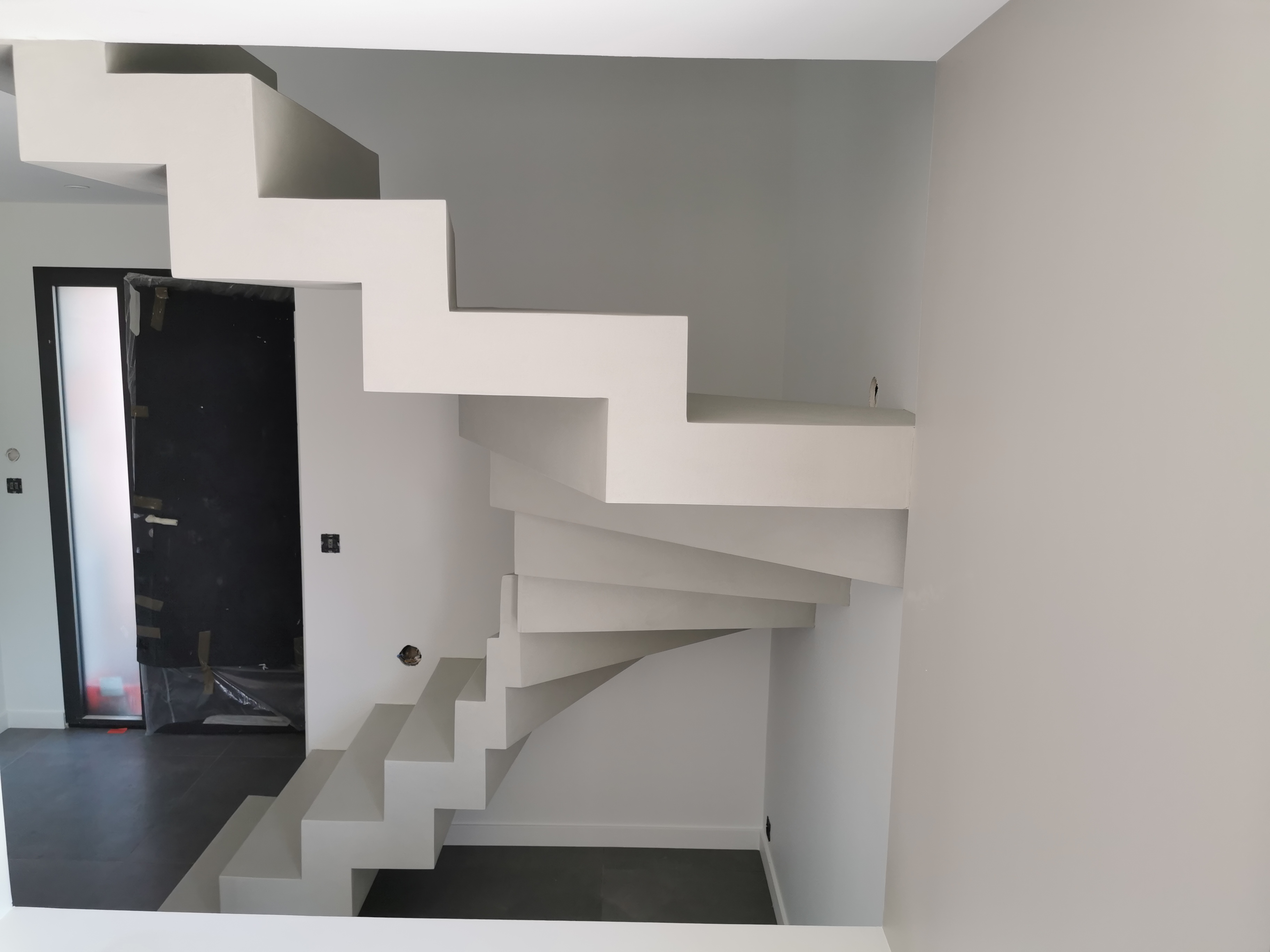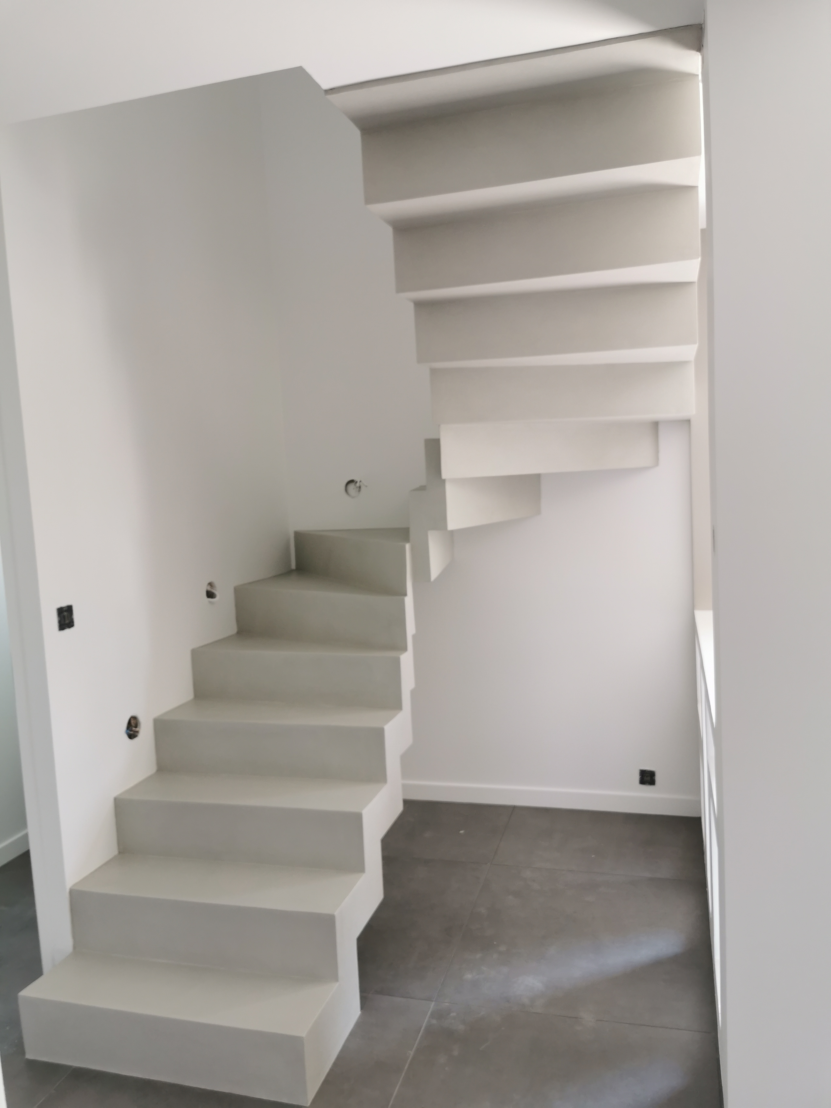 Magnifique escalier crémaillère deux quart balancé en béton ciré vernis mat couleur poivre blanc