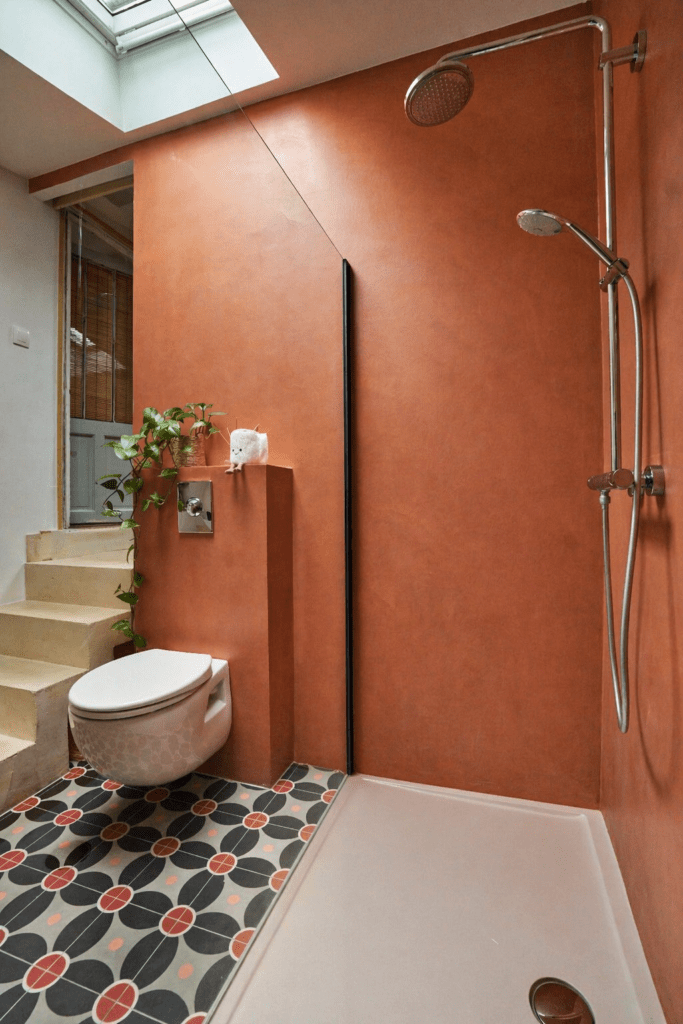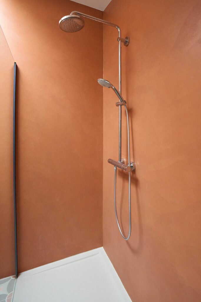 Dans cette échoppe du centre de Bordeaux, cette salle de bain mise sur la matière pour créer une atmosphère chaleureuse et enveloppante. Le béton ciré teinte terre d’argile, signé Marius Aurenti et appliqué par Yohan Salvador, artisan béton ciré Aquitaine, habille les murs avec une profondeur minérale et subtilement nuancée.