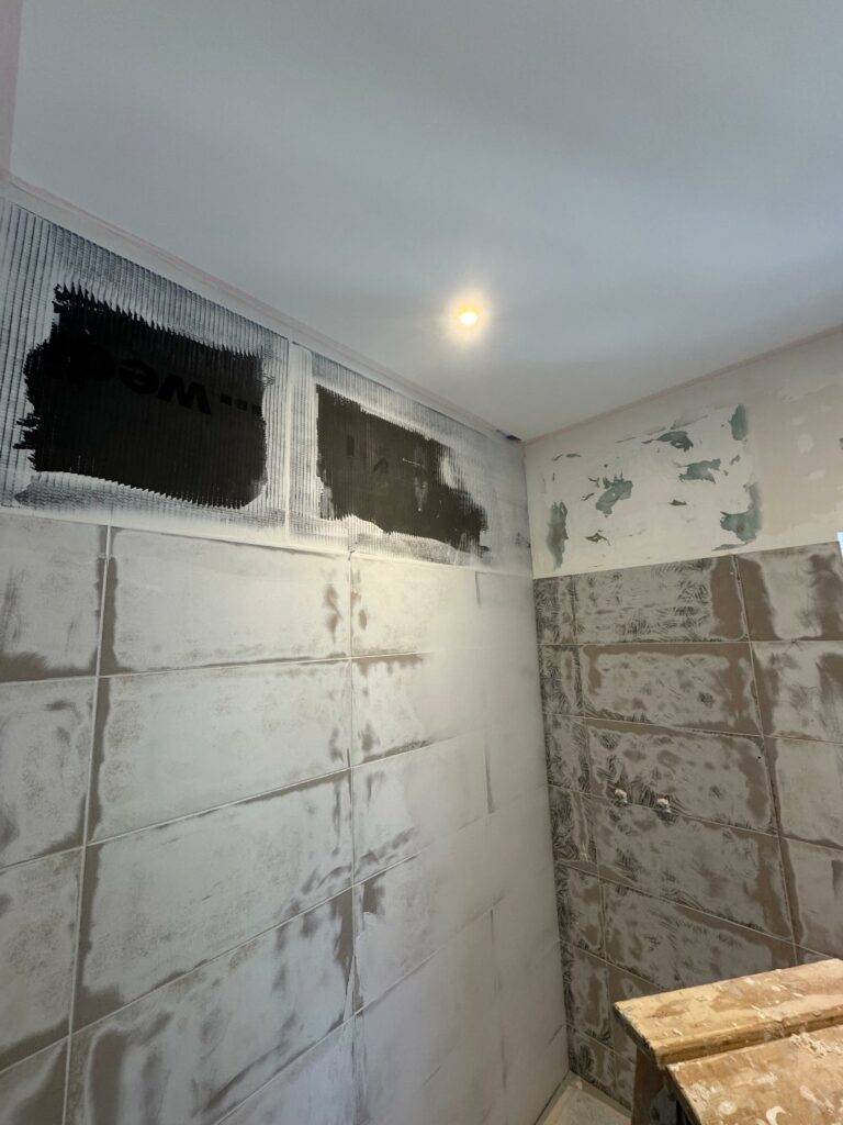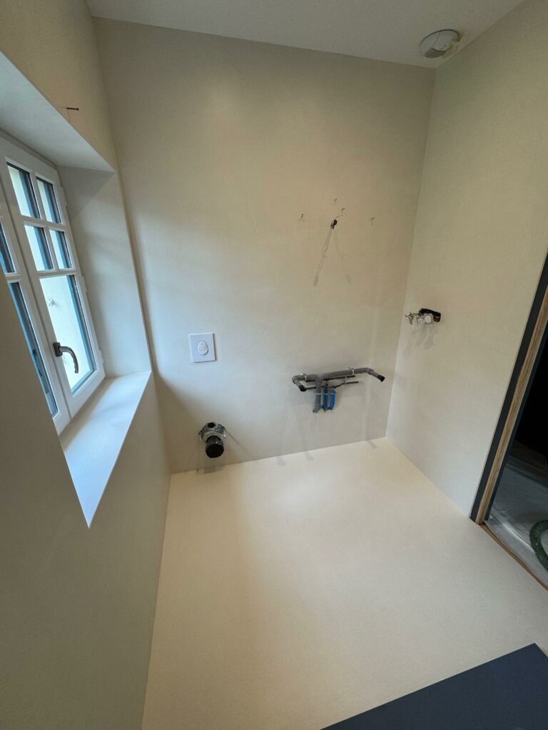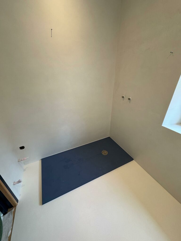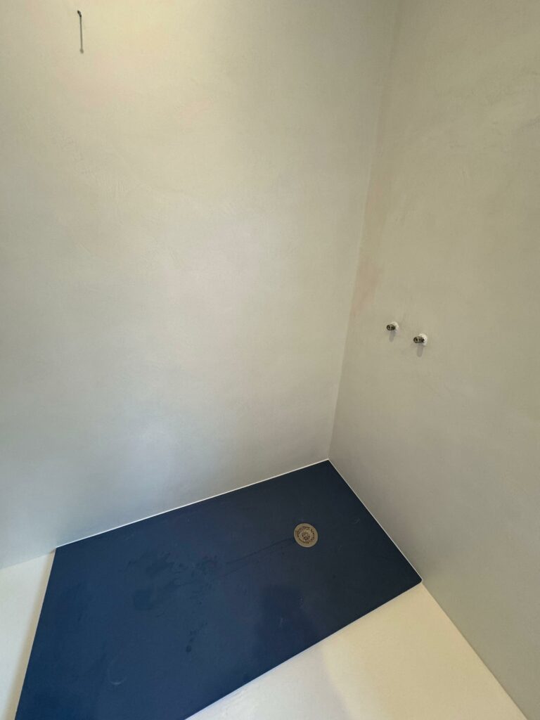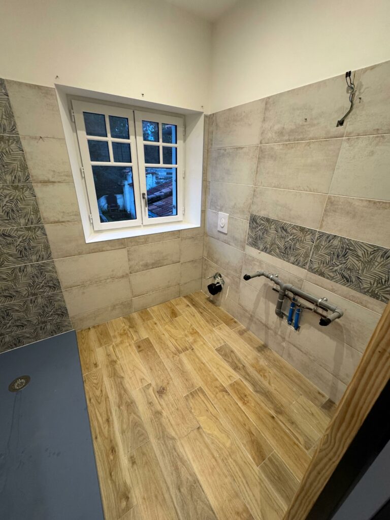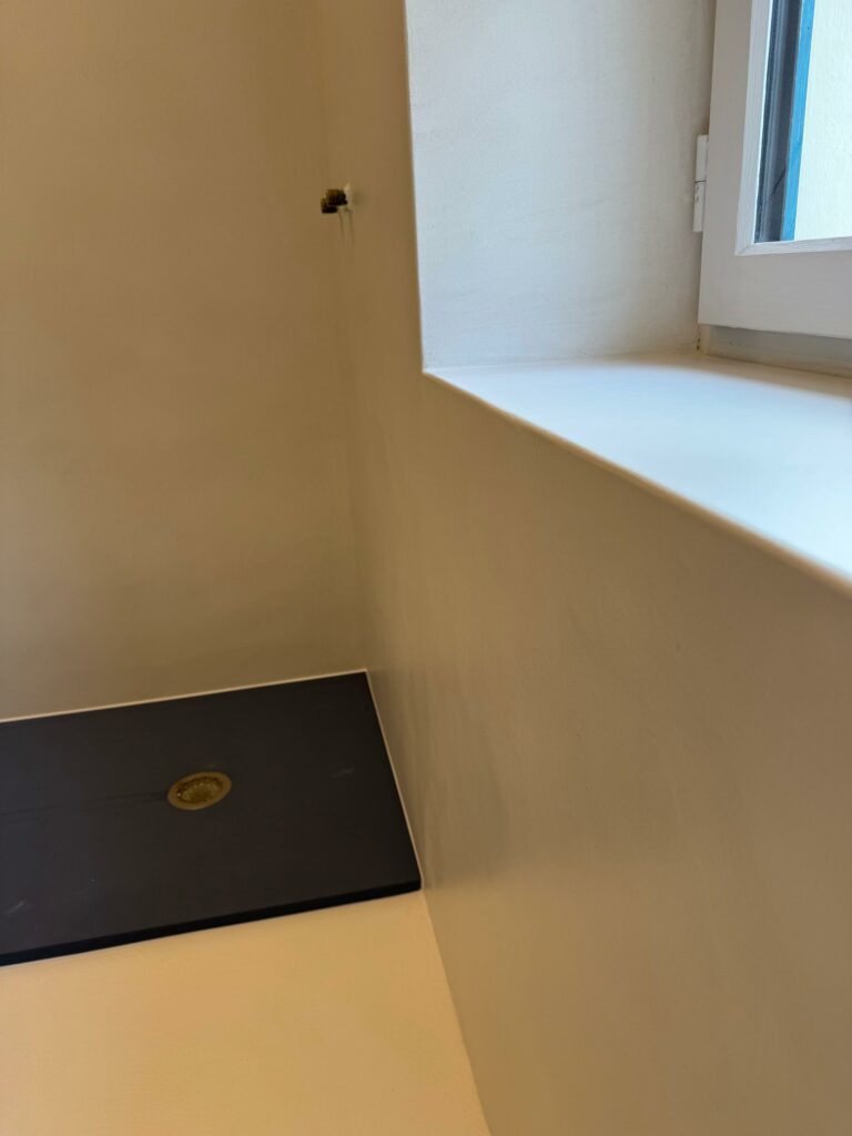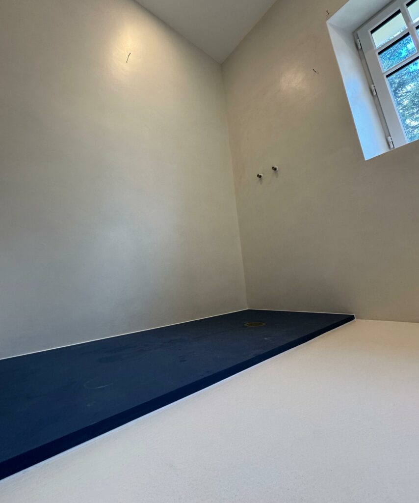 💥 À Bassussarry, cette salle d’eau a été entièrement modernisée grâce à l’application d’un béton ciré couleur Craie d’ AdLucem sur l’ancien carrelage en grès cérame.
