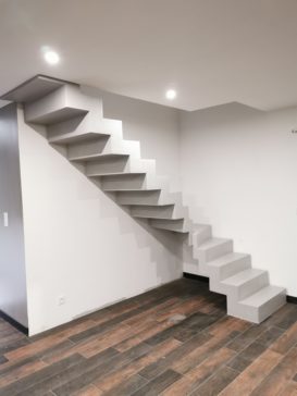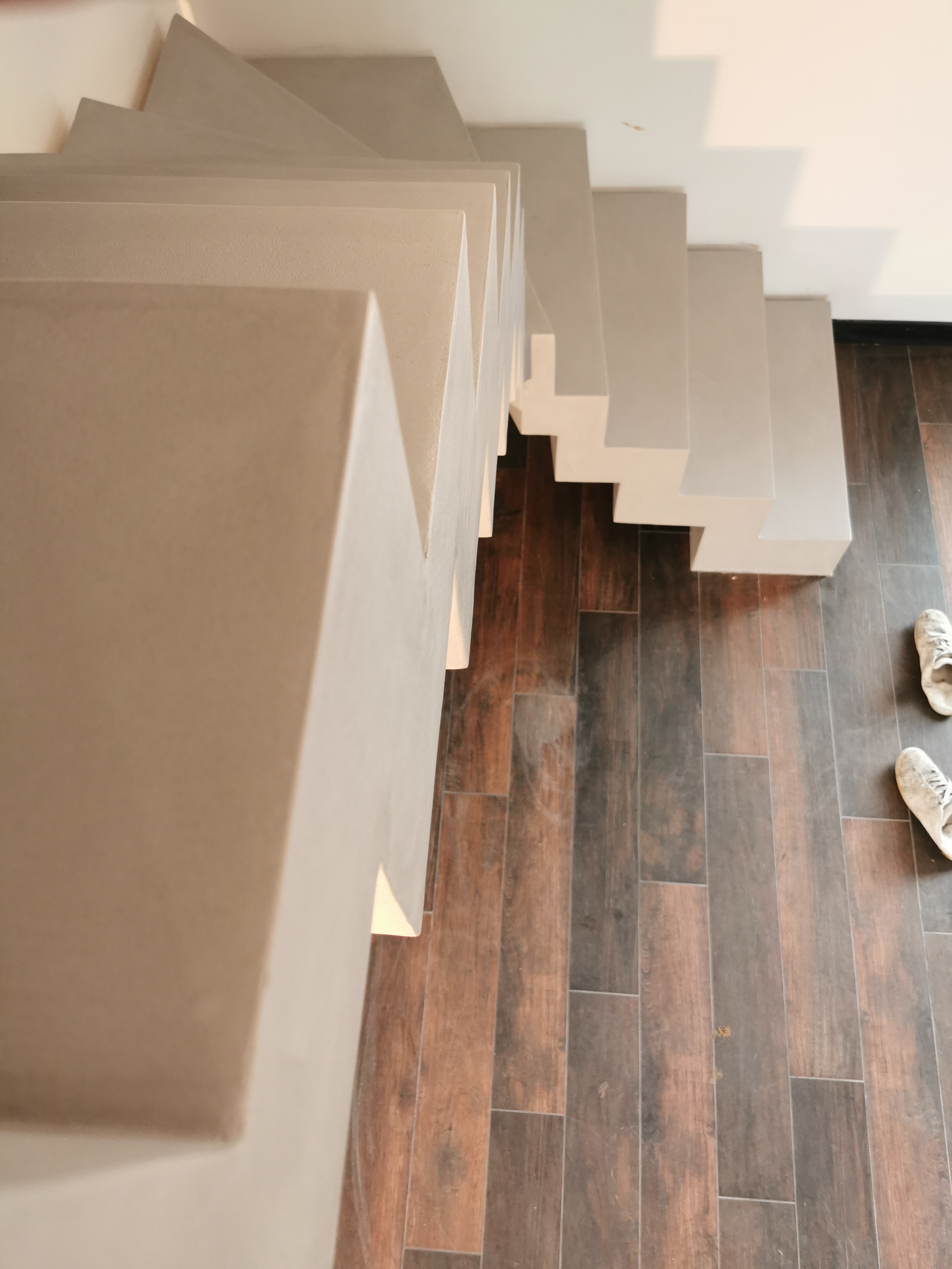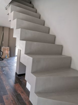 Sublime escalier crémaillère décollé du mur en béton ciré vernis mat couleur gris souris