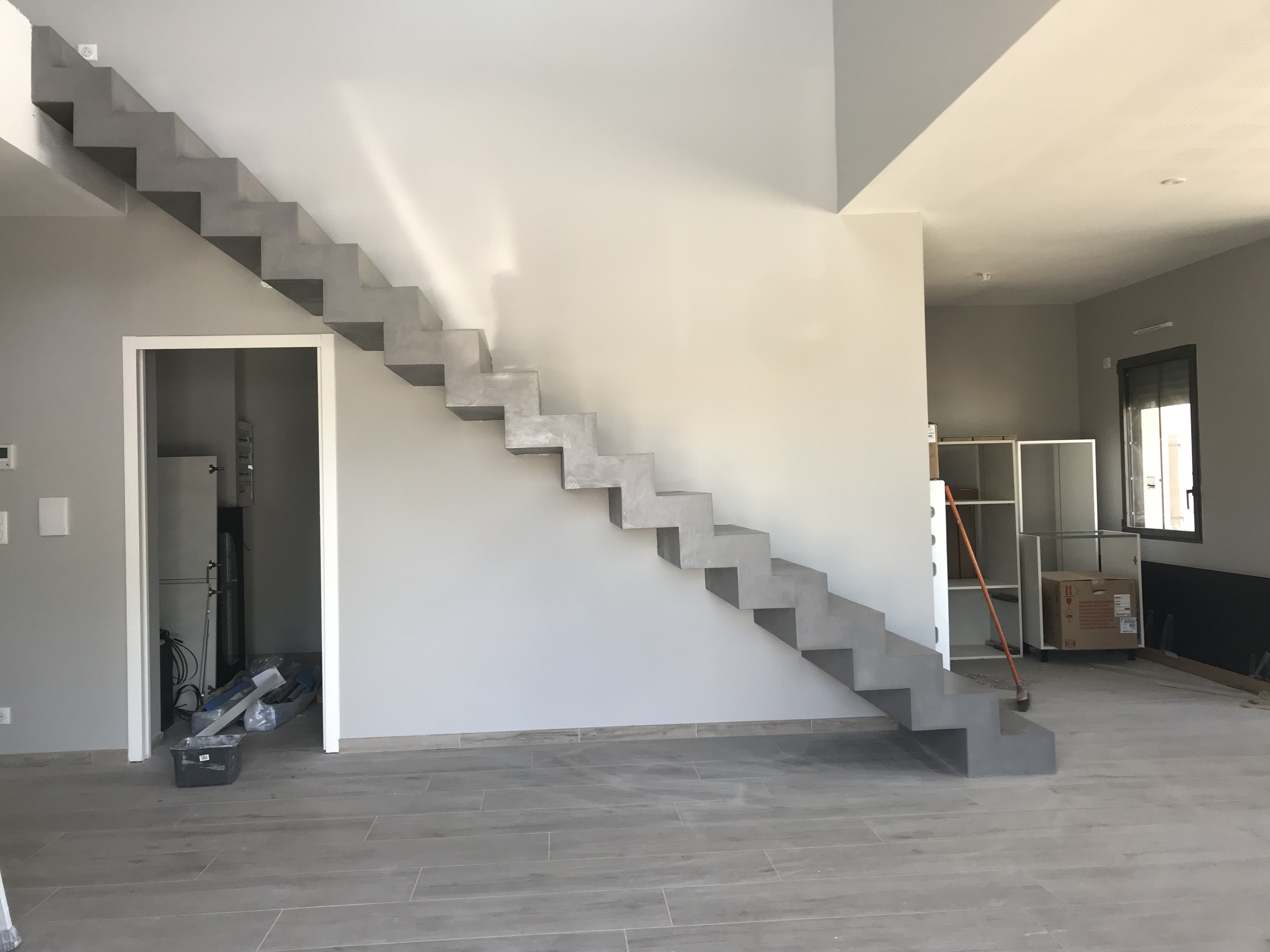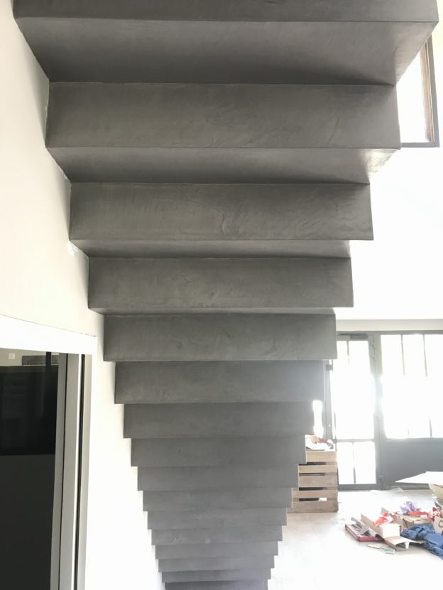 Sublime escalier crémaillère d’un salon en béton ciré couleur aluminium